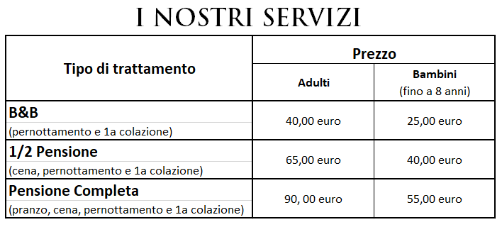 I prezzi si intendono a persona al giorno ed includono: posto macchina, elettricità, biancheria, pulizia settimanale con cambio biancheria, uso piscina (1/2 pensione e pensione completa).